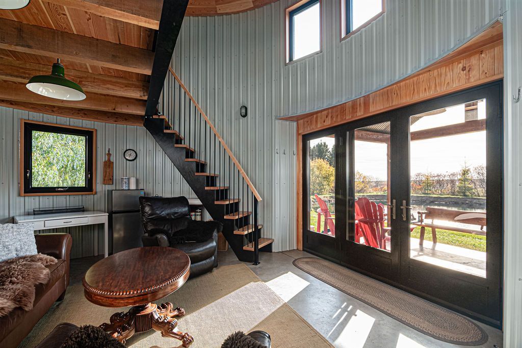 The Solution: This project tested our team at Kooger Custom Homes & Renovations, but they met all challenges head-on with a mixture of ingenuity, problem-solving, and high level craftsmanship. The first problem to be solved was “how do you frame the completely rounded interior of a cylinder?” We stud-framed the interior of the silo and then spray foamed the walls and ceiling. We added rough sawn Douglas Fir supports for the exterior canopy, tongue and groove fir on the upper level loft/mezzanine floor, and fir tongue and groove on the sloped, curved ceiling. We installed a large 3 pane door for an expansive entrance, showcasing a great view of the surrounding nature. Once inside, a custom curved staircase takes you up to the truly one-of-a-kind sleeping space of the loft/mezzanine.